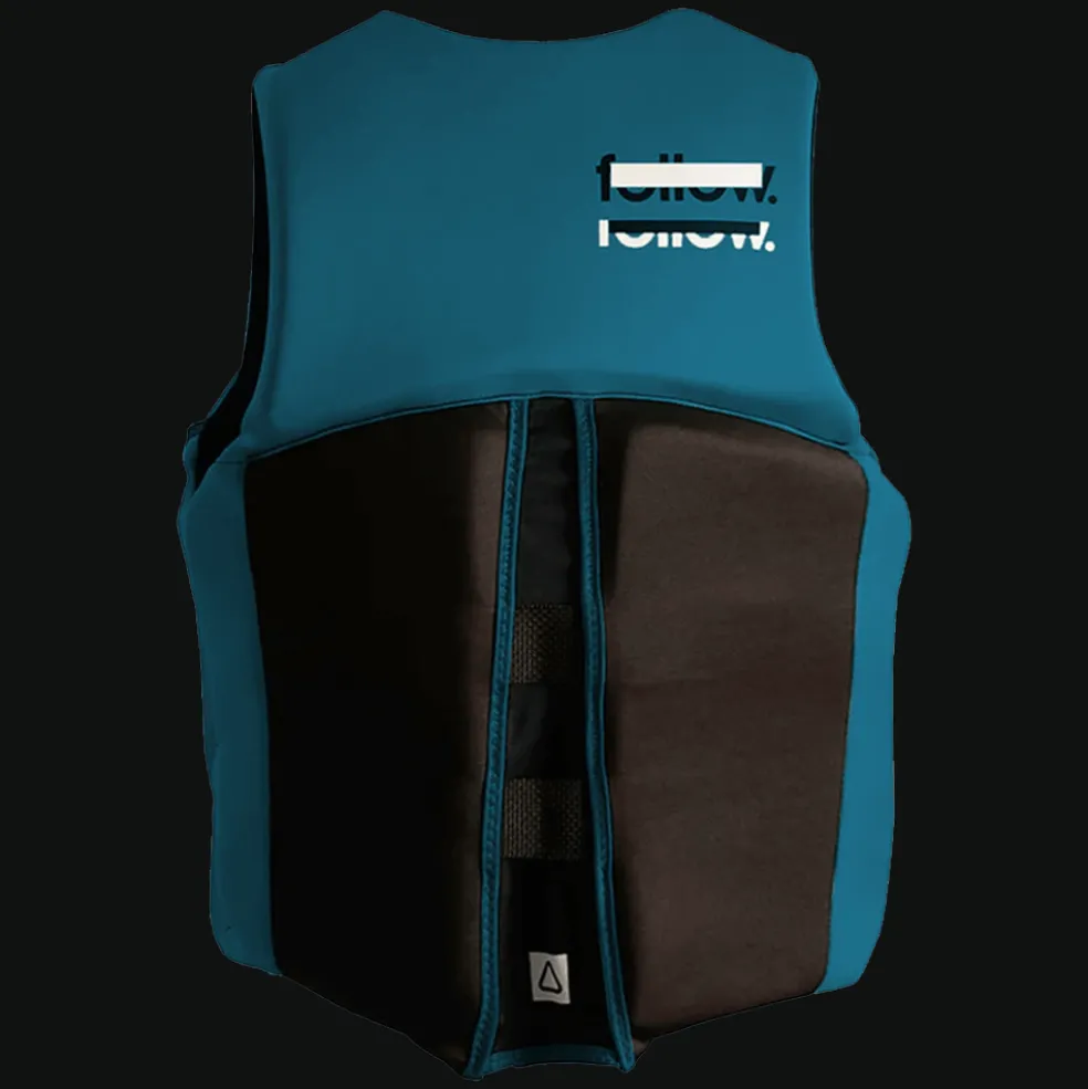 Wet neoprene increases in size by roughly 10%, depending on thickness and materials. Follow uses both external and internal neoprene layers to minimize this effect. Dual Layer neoprene keeps the vest fitting as intended and helps to reduce chest expansion in the water.