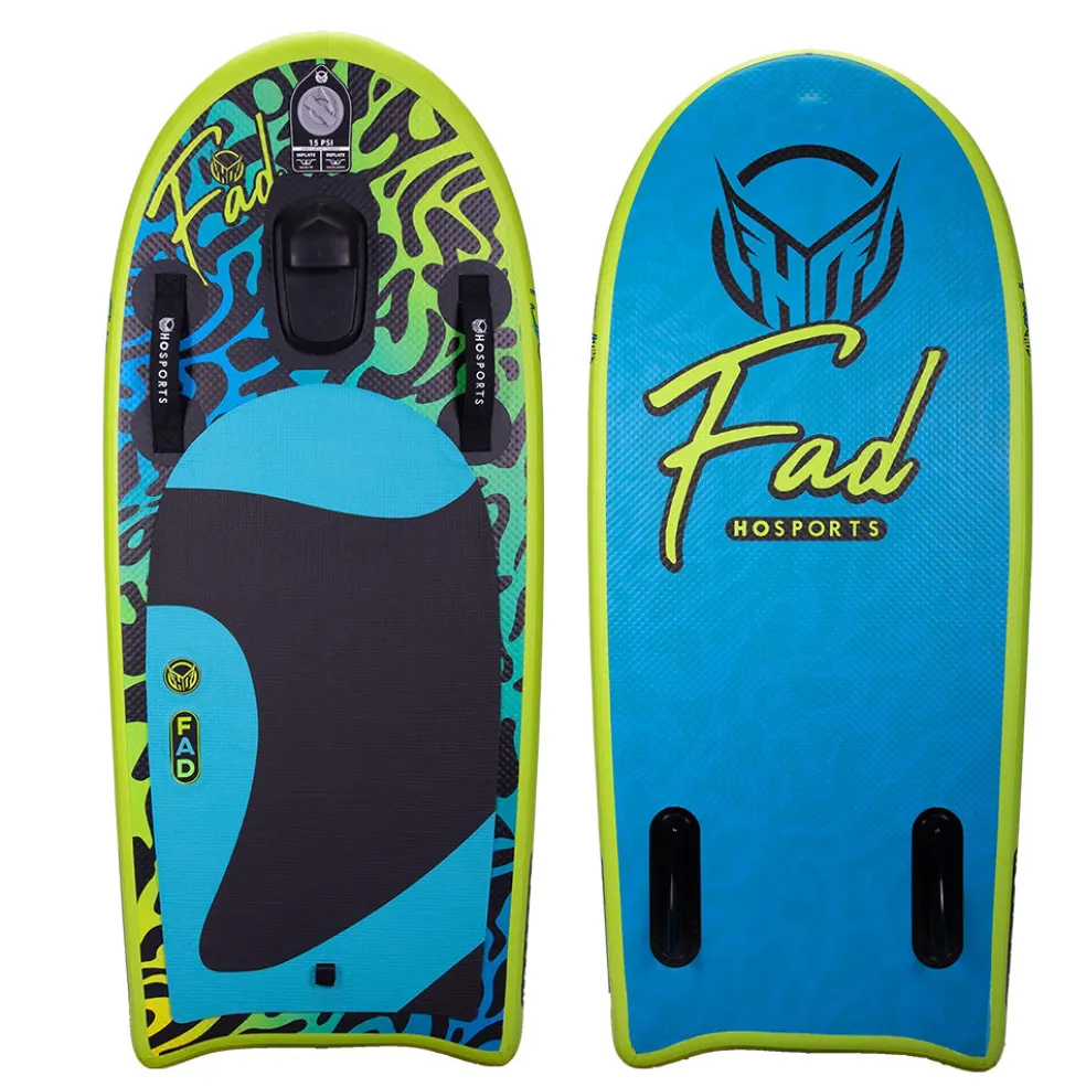 Easy to inflate & deflate with a surf inspired shape, the FAD boards are built with a durable drop-stitch construction making them rigid when inflated and super compact for storage when deflated. Their Machined EVA Traction Pads makes them grippy for wakesurfing and wakeriding while the soft EVA handle hook and dual handles permit easy getups and hands free riding. You can kneel, lay, stand or sit on the multi-functional FAD boards. Endless riding possibilities await, unlocking a realm of pure imagination for you, your friends, and family. Suitable for all ages, the FADs are sure to capture attention on your lake this summer, bringing joy and excitement to everyone!