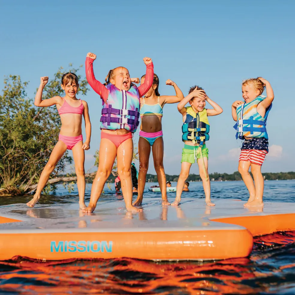 Most floating mats are built for lounging. But when kids are around, nobody stays still for long. We wanted to build a mat that welcomed the action — something big enough for a full crew and easy to climb onto from any direction. The mesh Easy-Up sides make getting back on the mat quick and natural, while the heavy-duty drop-stitch construction keeps the platform stable and strong.