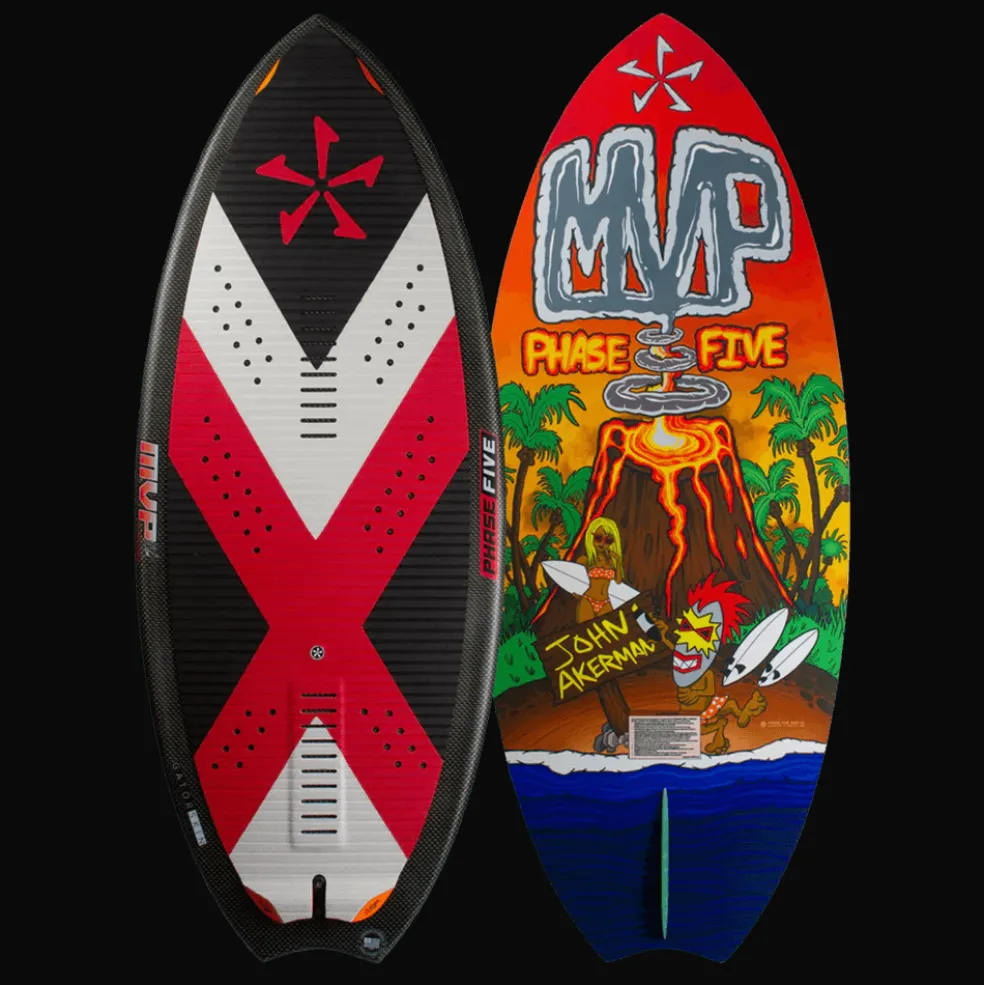 Supporting aggressive skim style riding, the Phase Five MVP Wakesurfer harnesses unique features not found anywhere else in our lineup. First you will notice a full decked Techno Traction V2 EVA grip pad with nose kick tail support for superior foot control. John’s idea for a kick tail in the nose was to gain more leverage to execute tricks while riding revert. The MVP is the only board with our RidgeGrip technology, a unique rail design inspired by his direct feedback. RidgeGrip stiffens the board and offers a pronounced spot to grab when executing tricks above the lip. The moon tail design and V-Spline bottom contours deliver maximum speed and handling. The MVP LTD boasts our brand new lightweight, insanely fresh looking ChromaCarbon construction and built with a single fin setup loaded with our 1” Skim Fin.