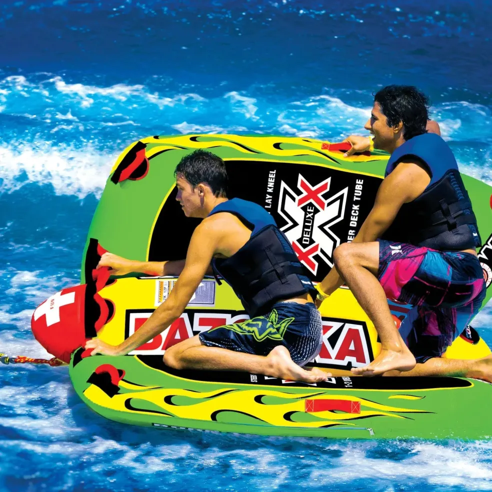 Deck Tubes have been the bestselling style of tubes for years, but they havent changed much since they first hit the market 20 years ago. WOW wanted to develop a more exciting, multi-functional deck tube with options. What we came up with is the Big Bazooka. It is a completely new style deck tube that allows you to do much more than the traditional deck tube. The Big Bazooka holds up to 4 riders and can be used in 1, 2, 3 and 4 person configurations. You can kneel, sit, stand or lay on this deck tube. You can still hold on for dear life as the boat driver does twists and turns, but the best part of the Big Bazooka is that you can also take control of your ride. Our patent pending Flex Wing system allows the riders to be in control. Steer by yourself or as a team and fly back and forth over the boat wake while the boat driver goes straight. The testing team at WOW thinks this is the most exciting deck tube to hit the market EVER!