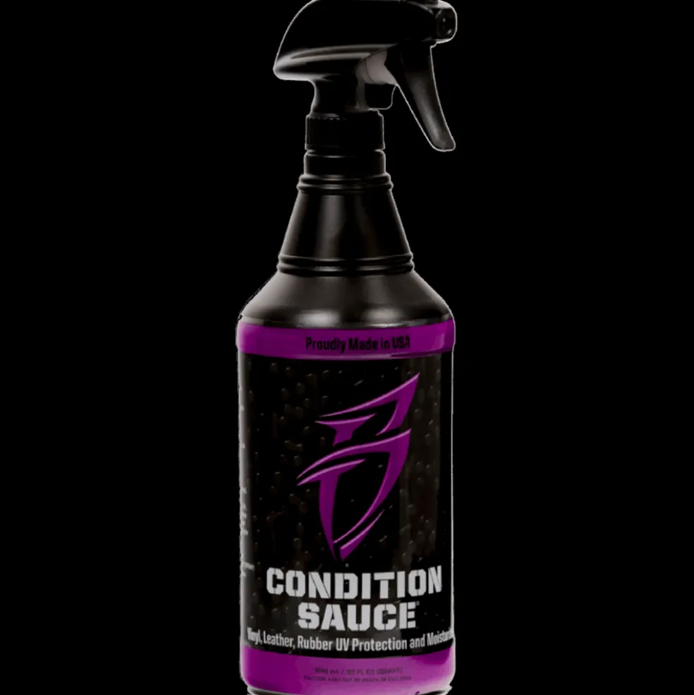 You wouldn’t think of sitting in the sun all day without protective clothing or sunblock. Protect your investment. Unlike generic surface dressings that leave greasy, slippery residue, Condition Sauce is a functional UV protectant designed to block the sun’s harmful rays, prevent fading, cracking and discoloration from vinyl, leather, rubber, and plastic while moisturizing the material to provide the stunning ‘like new’ look.
