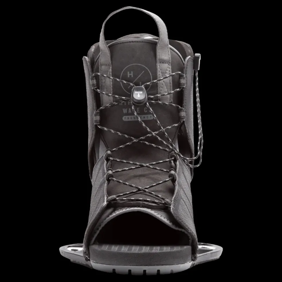 The Hyperlite Frequency is a One Size Fits All binding option atop our Low Pro Plate System. The Frequency is ideal for men’s sizes 6-12 and can accommodate smaller and larger feet as well. This adjustable binding opens wide for an Easy On Fit and is simple to secure with the quick cinch lace zone. Comfort is guaranteed and our Molded EVA Footbed provides impact protection while landing your first wake to wake jump.