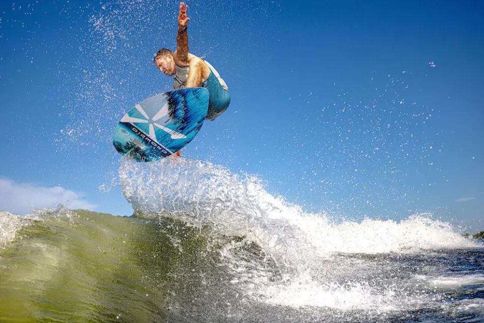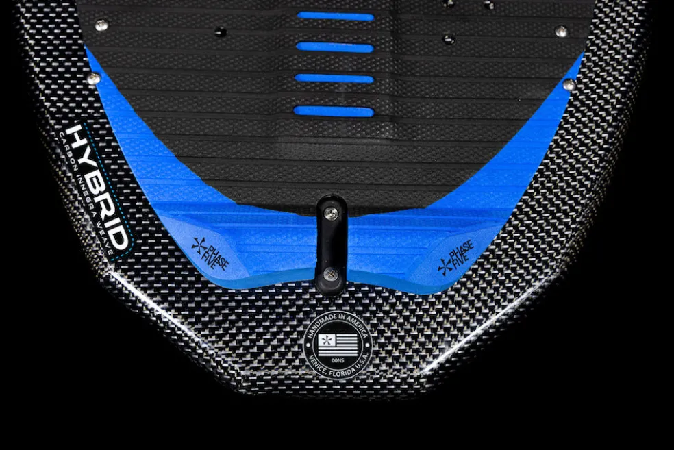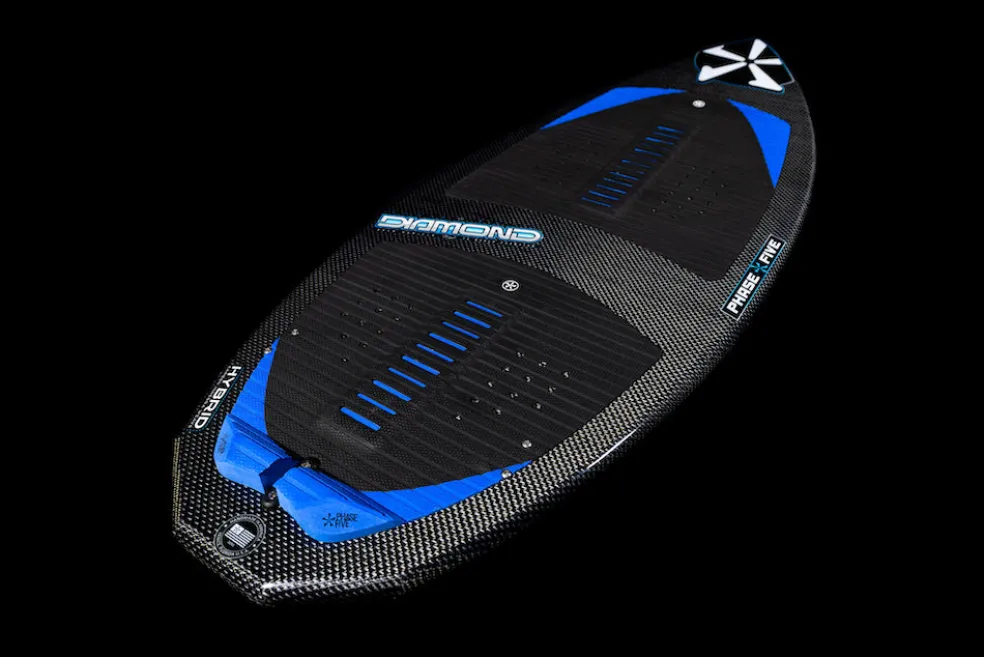 Drew Danielo wanted more pop and speed, and that is exactly what we created with the Phase Five Diamond Turbo Wakesurfer. We enhanced the original Diamond tail shape with a wider, more boxed out design. This upgraded design feature delivers experienced riders the opportunity to go big. The Turbo tail design is also the solution for large riders who need more push and surfers using smaller, less powerful waves. The Diamond Turbo is built using our unique Hybrid Carbon™ material for ultimate strength. We configured the Diamond Turbo with a three fin setup installed with our 1” Skim Fin (2” on the 57”) in the center accompanied by 1” Fakie Skim fins on the outside.