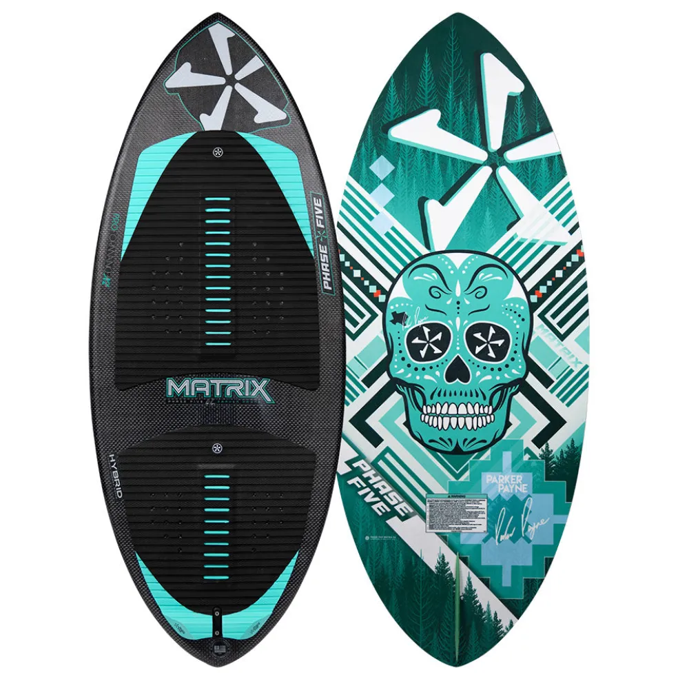 The Phase Five Matrix Wakesurfer is an advanced board delivering unrivaled performance. Adopted by many professional riders on the team, the Matrix is sealed and approved to meet the highest expectations. The Matrix is made with a thinner core and boxy rails for ultimate POP and responsiveness. The symmetrical outline rides incredibly well backwards while the subtle V-Spline bottom contours generate trick demanding speed and sensitivity. It includes an added carbon stringer for next level pop, and is constructed with Hybrid Carbon™ material to take a beating.. The Matrix is built with a single fin setup and loaded with our 1” Skim Fin. The Matrix Payne Pro features a unique bottom graphic that Parker Payne dreamed up. No specific design or construction features differentiate the Payne Pro from the Matrix.