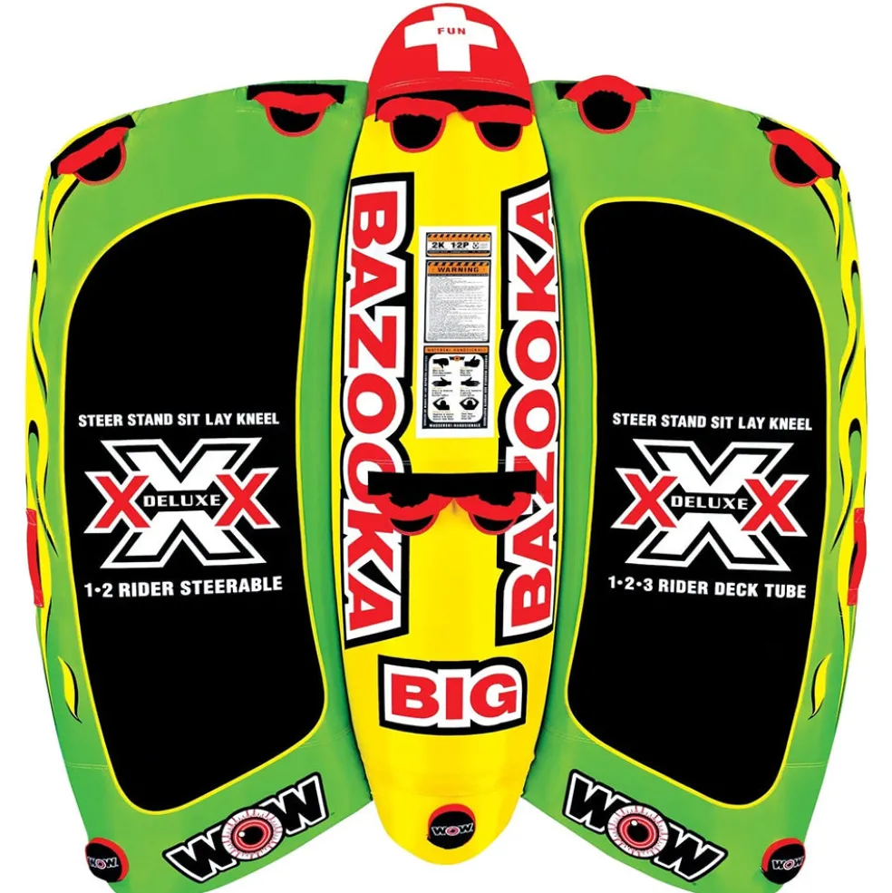 Deck Tubes have been the bestselling style of tubes for years, but they havent changed much since they first hit the market 20 years ago. WOW wanted to develop a more exciting, multi-functional deck tube with options. What we came up with is the Big Bazooka. It is a completely new style deck tube that allows you to do much more than the traditional deck tube. The Big Bazooka holds up to 4 riders and can be used in 1, 2, 3 and 4 person configurations. You can kneel, sit, stand or lay on this deck tube. You can still hold on for dear life as the boat driver does twists and turns, but the best part of the Big Bazooka is that you can also take control of your ride. Our patent pending Flex Wing system allows the riders to be in control. Steer by yourself or as a team and fly back and forth over the boat wake while the boat driver goes straight. The testing team at WOW thinks this is the most exciting deck tube to hit the market EVER!