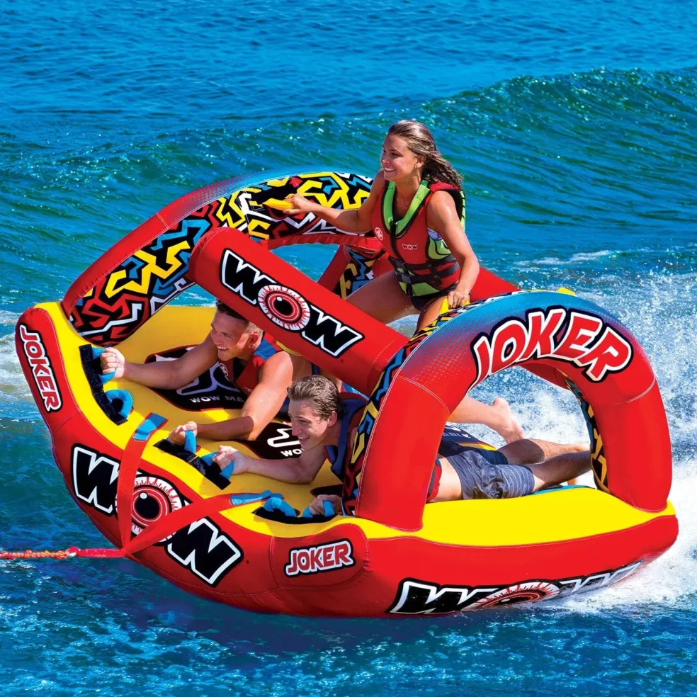 WOW isn’t joking around when it comes to making Major League Towables. The JOKER is the latest and greatest on the water. DonÕt be a fool at the lake and BE SEEN, this HIGH-PROFILE design will sure draw some attention and entertain the ones brave enough to ride AND the bystanders alike. Built with a state-of-the-art design, introducing the exclusive WOW POWER TOWER. The Power Tower System gives riders countless options when it comes to how they ride. Stand, Kneel, Sit, Lay or even Handstand, if you’re a jokester like that. The winged bottom minimizes the drag and hugs the riders so they can feel secure — even when it gets out of hand! Riding solo? Guide your ride using the Power Tower as leverage to steer and glide across the waves.